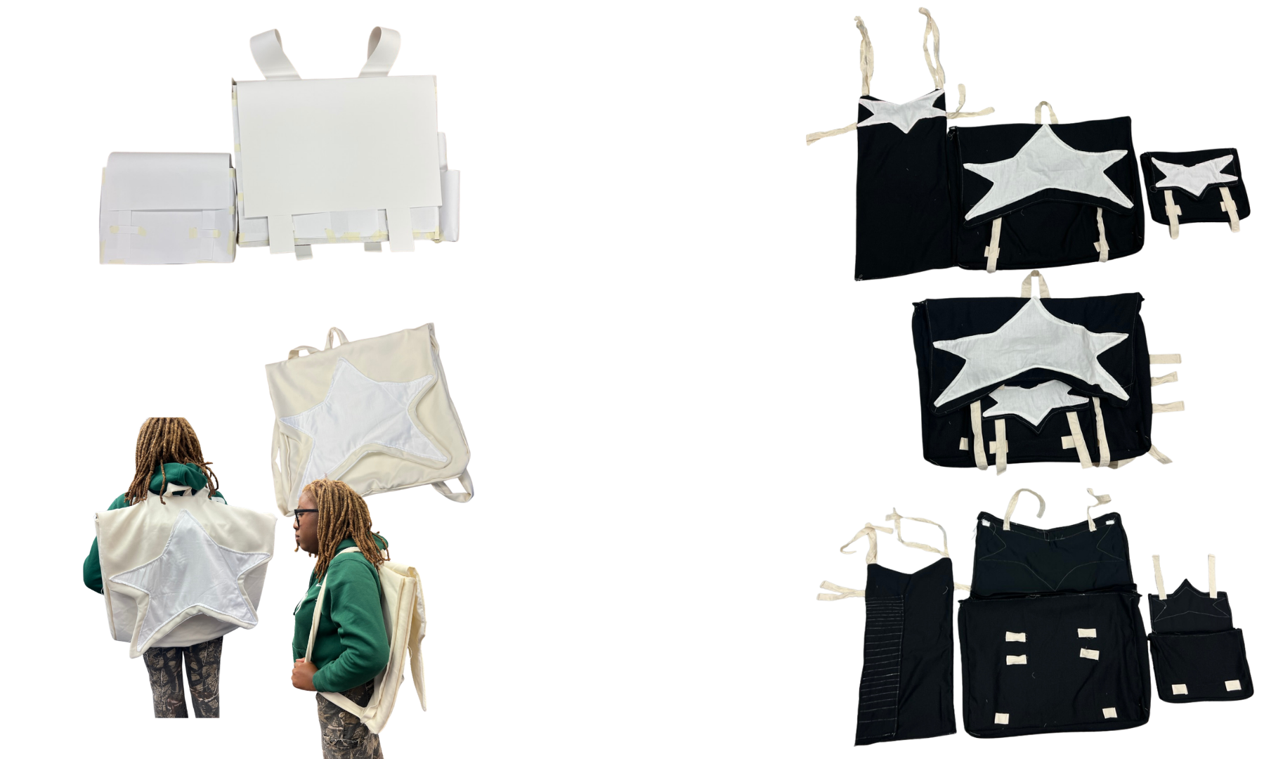 Fabric mockup of all three modules. Tried out attachment points, specific measurements. Learned more about what the bag was lacking