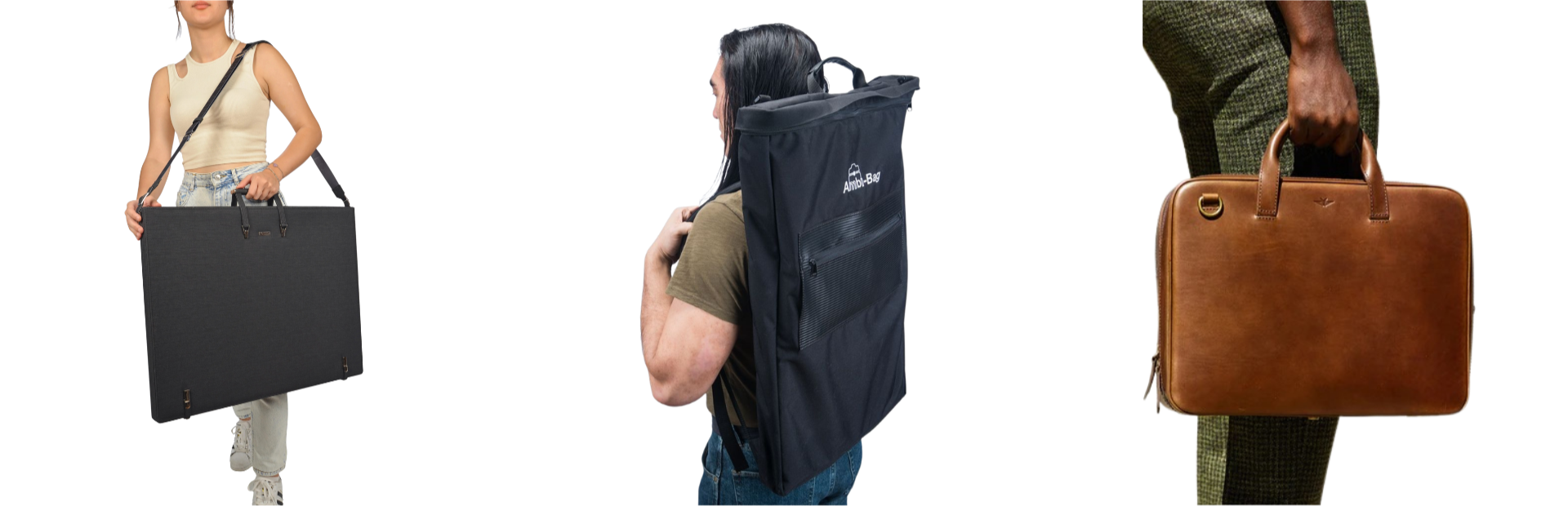 Most common kind of portfolio bag, however, it's hard to carry and the shoulder strap causes pain especially with the added backpack. Often times has only 1-2 pockets, so it's not very organized either.